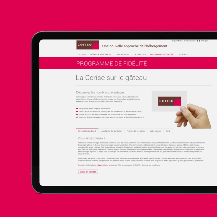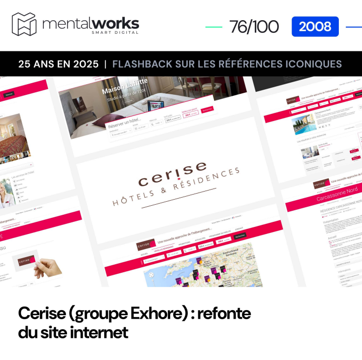 Nous avons eu le privilège d’accompagner CERISE Hôtels & Résidences dans la refonte complète de son site internet, puis d’assurer sa maintenance corrective et évolutive pendant quinze années.