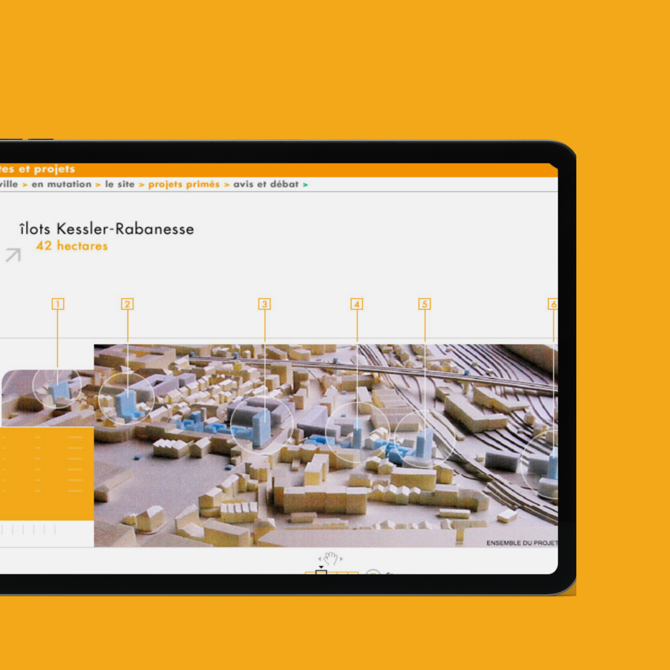 Présentation interactive multimédia de chaque site/ville/pays proposé aux équipes d’architectes pour le concours avec le contexte, les enjeux, les attentes de la collectivité.
