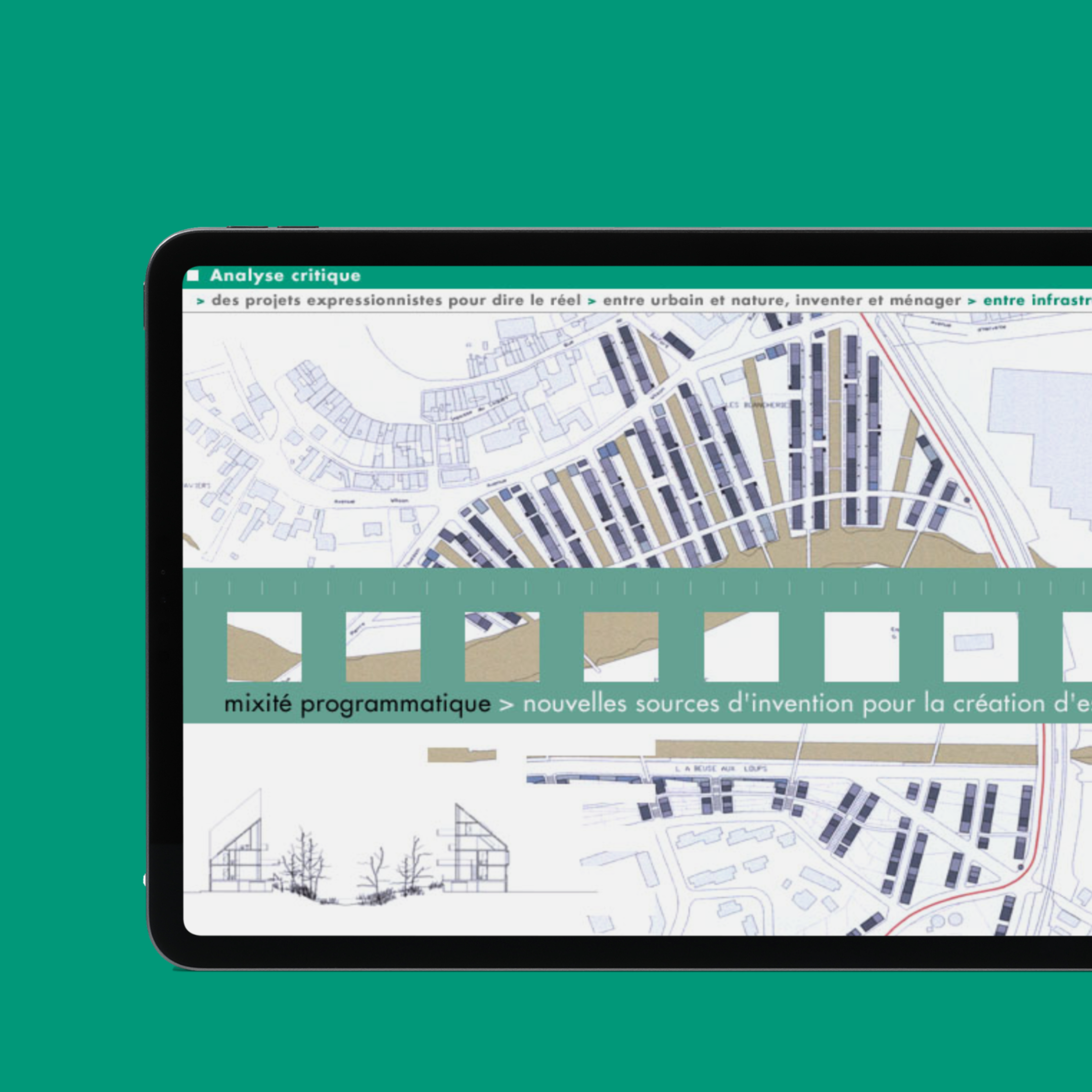 Présentation des projets de chaque équipe d’architectes avec zoom sur plans, enchaînement de diapositives, vidéos, interview et annexes téléchargeables